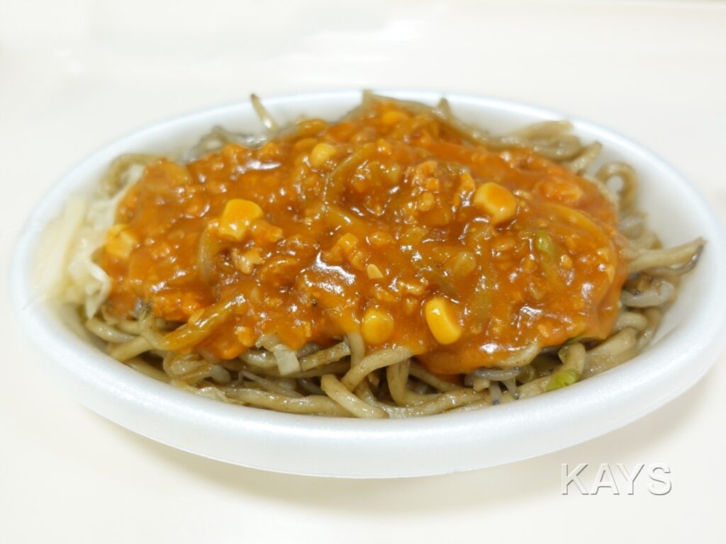 なぁるほど!見た目は一瞬ミートソースのパスタを思わせますが、そのソースから顔を覗かせている麺は茶色く炒まっています。しかもモヤシも一緒。