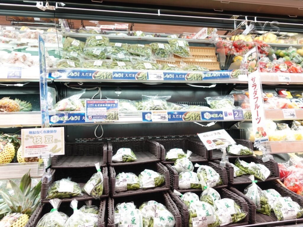 さて、再びラブラ万代に戻ります。お、スーパーのイオンがある!観光地を訪れると必ずスーパーに寄りたくなる我々。だって、置かれている食料品など、やはりその地元ならではの特徴が見えるので。案の定、こちらもそうでした。お魚が安いというのは、まぁ皆さんも想像つくと思います。が、我々の注目点は「枝豆」!新潟県民は枝豆を食べる際、東京で売られている袋の1袋くらいを一人で食べるというウワサ。確かに大量に枝豆が置かれています!袋もやや大きめかな……。ああ、あの噂は本当だったのだな……と納得する我々です。これを見ただけでも旅した甲斐があった!(笑)