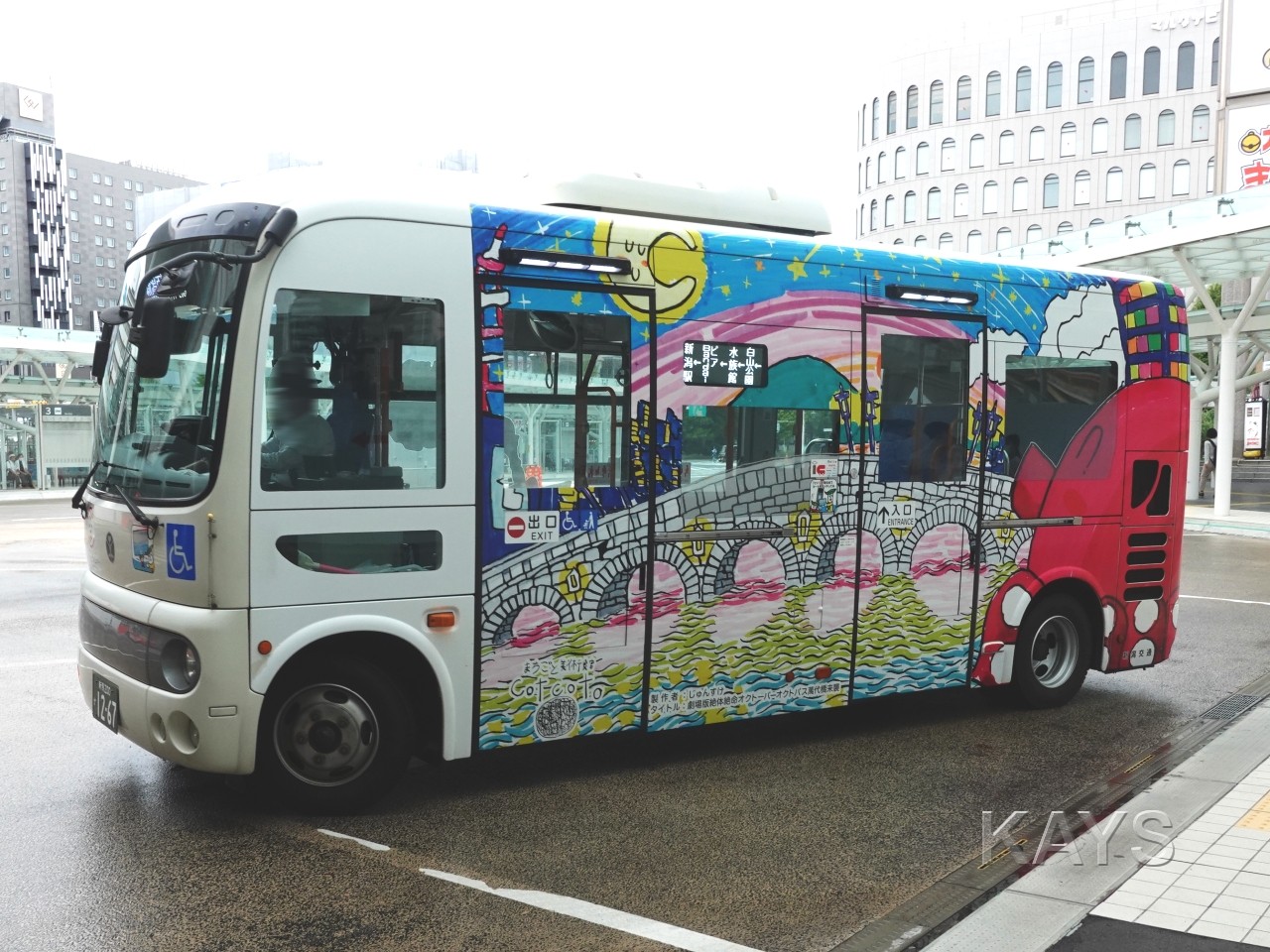 これもまた便利なのですが、駅ビルのエスカレーターを降りるとそこがバス乗り場。雨に濡れずにすむのです。循環バスの乗り場も。そう、実は今日は雨が朝から降っているんです。したがって、街中の散歩は今日はなしに。ただ、バスには乗ろうと思います。バスの中から観光名所巡りという、どこまでもものぐさな我々です。1周まわって1時間弱。それにグルメ旅で数軒訪れるということを加えればちょうど良いかも!何度か乗り降りすることもあるかもしれないので、1日乗車券をスマホで手に入れておきます。
