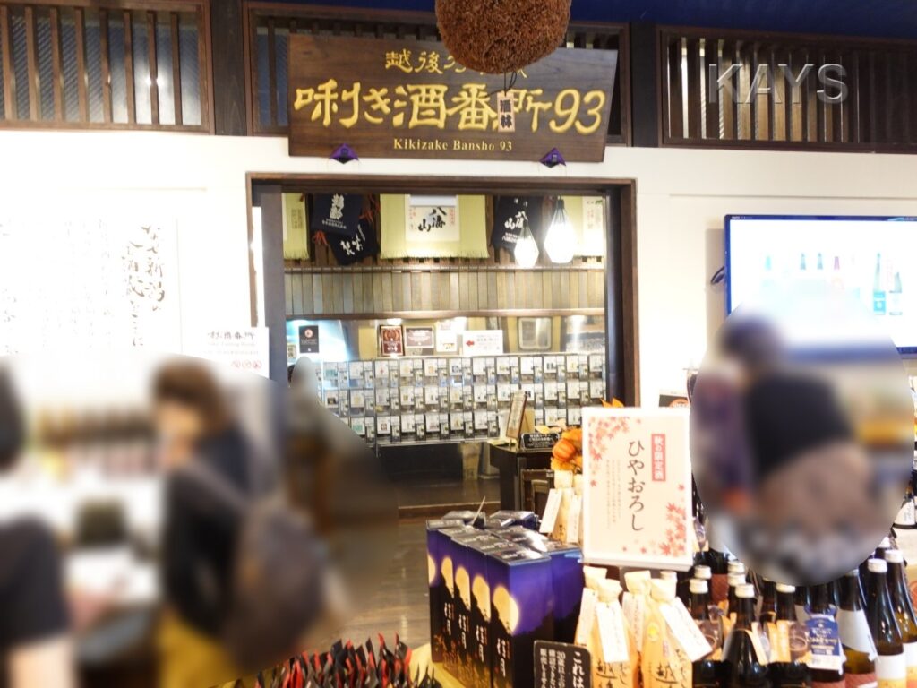 さて、新潟に来たからにはやはり「ぽんしゅ館」でしょ……というわけで、覗いてみます。平日昼なのにかなりのお客さんで賑わっています。近年の日本酒ブームもあるのでしょうが、若い方が多いのが印象的ですねぇ。そして、実はぽんしゅ館と銘打った場所は何カ所かCoCoLo内にあるのですが、そのうちの1箇所、「日本酒Bar 角打ち」と表示があるのが気になります。カウンターとテーブルがあり、ちょっとしたつまみとお酒が飲めるよう。ぽんしゅ館といえば、試飲が有名ですが、立つのも疲れるし……とナマケモノの二人ですから、こちらで一杯……となります。(^^;)