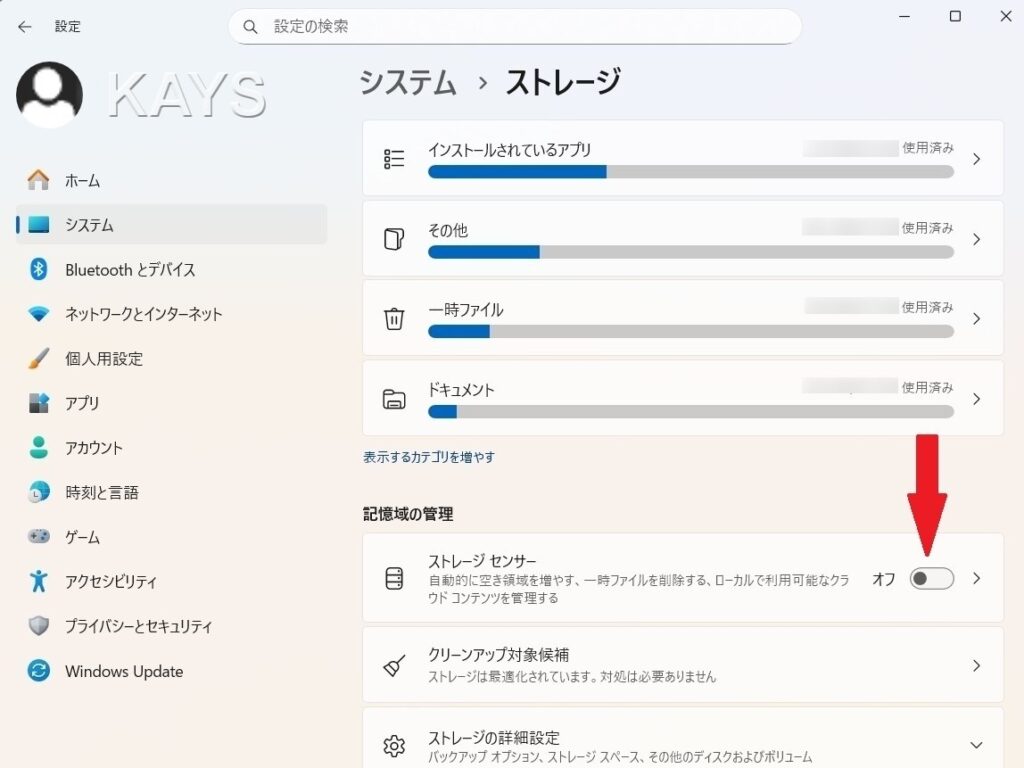 どうすれば良いのかな?とネットで調べてみたりしているうちに、「設定」→「システム」→「ストレージ」と進んだところで「ストレージセンサー」という項目が目を惹きます。へぇ、一時ファイルなどを削除することで自動的に空き容量を増やすんだ。これ、いいじゃない?と、深く考えずにONにしたのです。